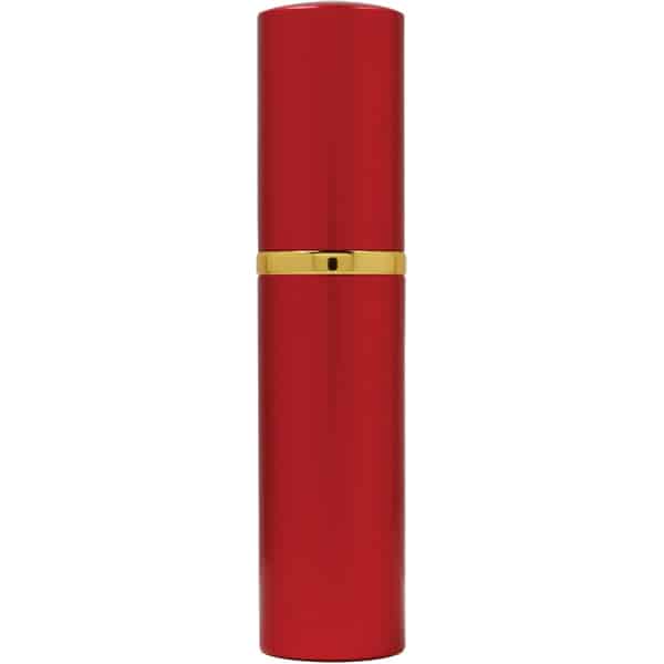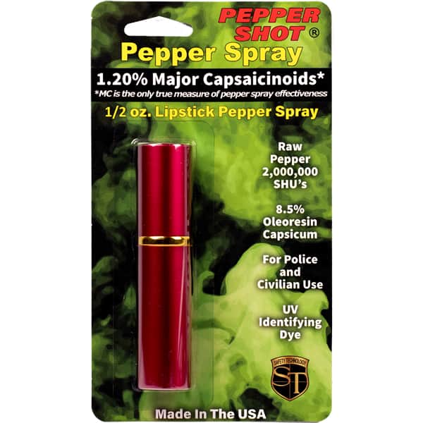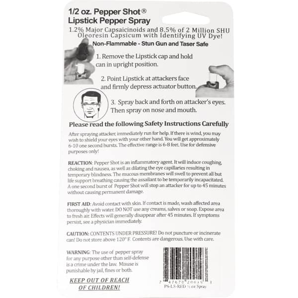 Pepper Shot 1.2% MC ½ oz lipstick pepper spray black. It’s designed for women. Pepper Shot Pepper Spray is made with 1.2% Major Capsaicinoids. The Major Capsaicinoids are the true heat measure and Pepper Shot 1.2% MC is more effective than of most other pepper sprays. In addition to causing an attacker pain, The Pepper Shot 8.5% oleoresin capsicum formula swells the mucous membranes, which makes breathing difficult, and swells the veins in the eyes, causing the eyes to close. It’s made from 2,000,000 SHU’s of raw pepper and these effects can last up to 45 minutes and cause no permanent damage. Has a UV identifying dye to help aid in the identification of an attacker. This lipstick model is designed for women. The attractive lipstick case is sure to deceive and ward off potential attackers. Pretend you need to freshen your lipstick and POW! This ½ oz canister contains 6-10 one-second sprays with a range of 6-8 feet and is available in 3 colors – Black, Pink, Red – 4″ x ½”