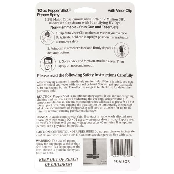 Pepper Shot 1.2% MC 1⁄2 oz w/auto visor clip. Pepper Shot Pepper Spray is made with 1.2% Major Capsaicinoids. The Major Capsaicinoids are the true heat measure and Pepper Shot 1.2% MC is more effective than of most other pepper sprays. In addition to causing an attacker pain, The Pepper Shot 8.5% oleoresin capsicum formula swells the mucous membranes, which makes breathing difficult, and swells the veins in the eyes, causing the eyes to close. It’s made from 2,000,000 SHU’s of raw pepper and these effects can last up to 45 minutes and cause no permanent damage.