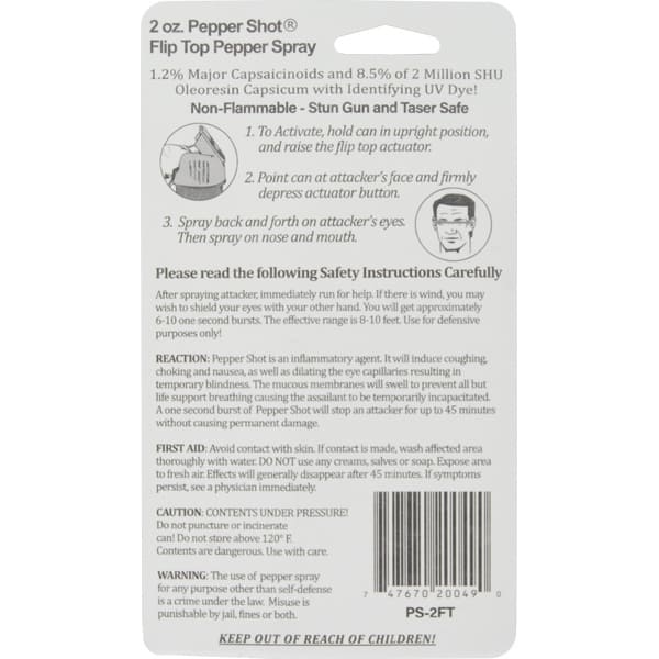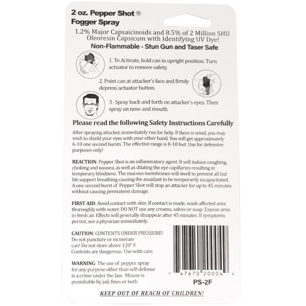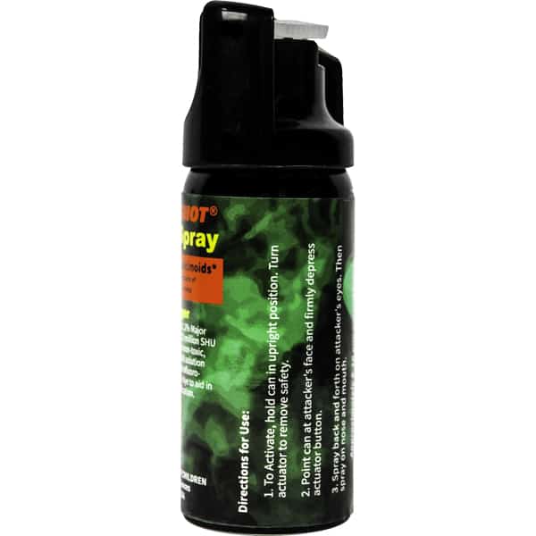 Pepper Shot 1.2% MC 2 oz pepper spray. Pepper Shot Pepper Spray is made with 1.2% Major Capsaicinoids. The Major Capsaicinoids are the true heat measure and Pepper Shot 1.2% MC is more effective than of most other pepper sprays. In addition to causing an attacker pain, The Pepper Shot 8.5% oleoresin capsicum formula swells the mucous membranes, which makes breathing difficult, and swells the veins in the eyes, causing the eyes to close. It’s made from 2,000,000 SHU’s of raw pepper and these effects can last up to 45 minutes and cause no permanent damage. Has a UV identifying dye to help aid in the identification of an attacker. Our 2 oz Pepper Shot is perfect for home use or carrying on your belt with the leatherette holster with belt clip.  Measures: 4 ⅛” x 1 ⅜”