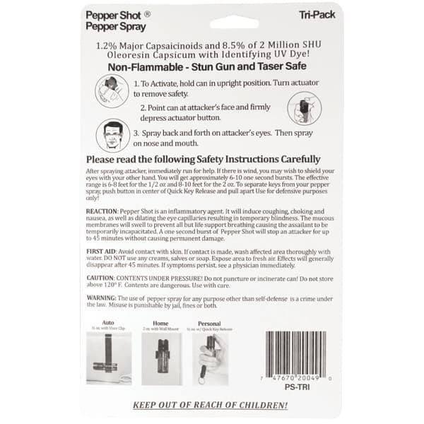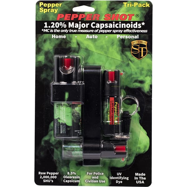 Pepper Shot 1.2% MC Tri-pack pepper spray. Pepper Shot Pepper Spray is made with 1.2% Major Capsaicinoids. The Major Capsaicinoids are the true heat measure and Pepper Shot 1.2% MC is more effective than of most other pepper sprays. In addition to causing an attacker pain, The Pepper Shot 8.5% oleoresin capsicum formula swells the mucous membranes, which makes breathing difficult, and swells the veins in the eyes, causing the eyes to close. It’s made from 2,000,000 SHU’s of raw pepper and these effects can last up to 45 minutes and cause no permanent damage. Has a UV identifying dye to help aid in the identification of an attacker.