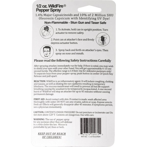 Wildfire™ 1/2 oz Pepper Spray w/Quick Key Release Key Chain. The WILDFIRE? PEPPER SPRAY is hot, hot, hot. The Major Capsaicinoids are the true heat measure, WildFire has the hottest on the market at 1.4% Major Capsaicinoids. In addition to causing an attacker pain, The WildFire 10% oleoresin capsicum formula swells the mucous membranes, which makes breathing difficult, and swells the veins in the eyes, causing the eyes to close. It’s made from 2,000,000 SHU’s of raw pepper and these effects can last up to 45 minutes and cause no permanent damage. Has a UV identifying dye to help aid in the identification of an attacker. Wildfire 1/2 oz. Pepper Spray has a range of 6-8 feet and comes with a quick release key chain and pocket clip. Each unit provides 6-10 one-second bursts and comes with a safety lock. 3 ⅝” x 1″